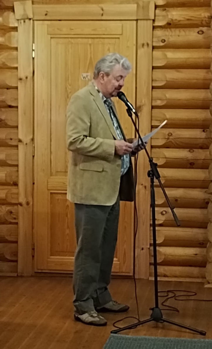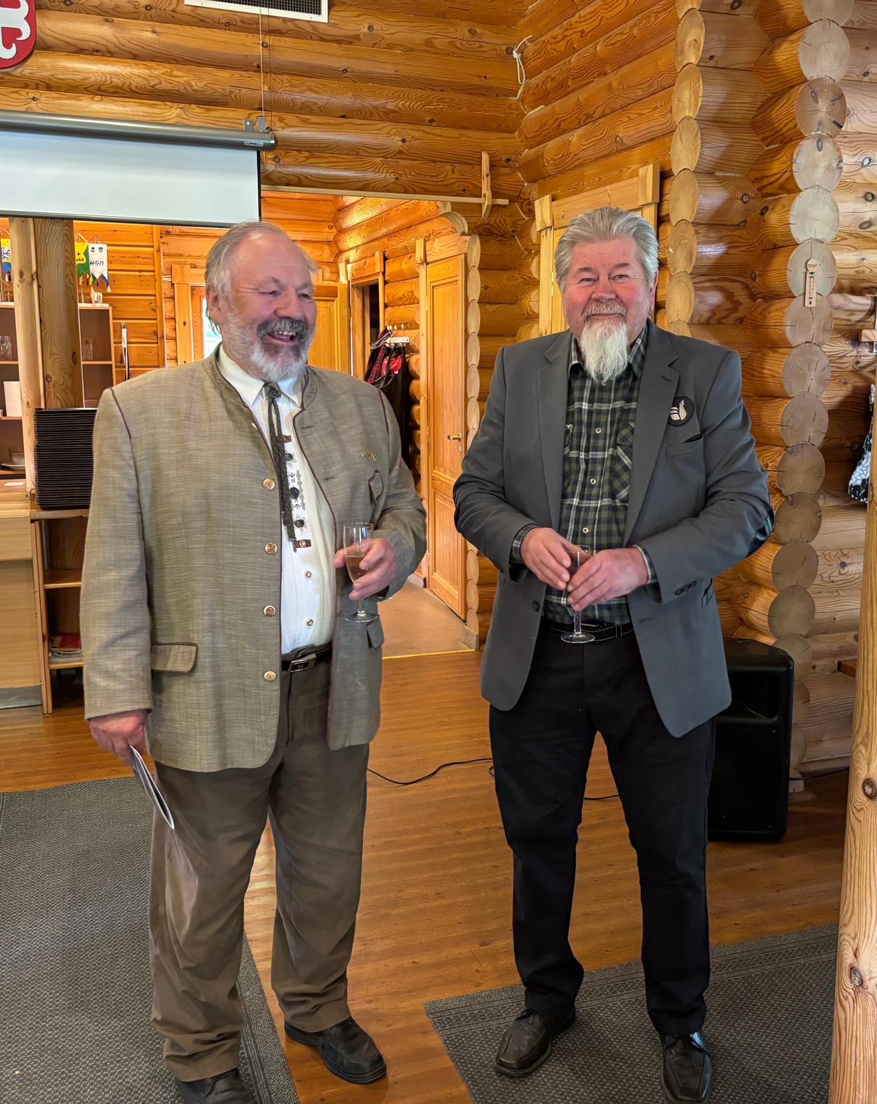 Tervehdykset juhlaan toivat myös, kuvassa (vasemmalla) Keski-Suomen alueellisen riistaneuvoston varapuheenjohtaja Reijo Vesterinen ja Metsästäjäliiton Keski-Suomen piirin puheenjohtaja Veijo Turpeinen.
